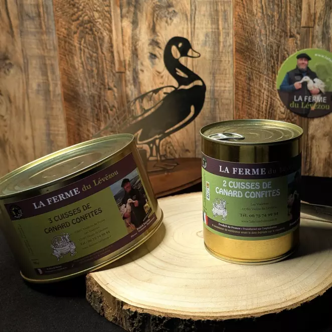 Savourez l’authenticité et le savoir-faire artisanal avec nos **3 cuisses de canard confites**, un produit d’exception directement issu de LA FERME du Lévézou. Préparées avec passion à partir de canards élevés en plein air et gavés sur l'exploitation dans le respect des traditions et du bien-être animal, ces cuisses confites sont transformées sur place, sans intermédiaire, pour garantir une qualité irréprochable et une traçabilité parfaite.